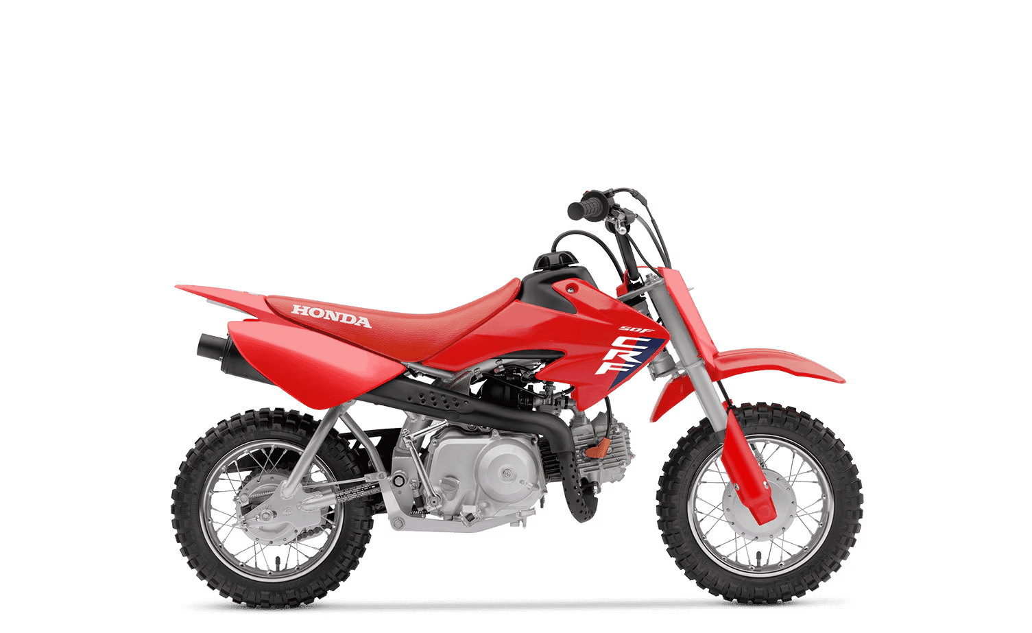 A perfect first bike for young riders, the CRF50F has a smooth four-stroke engine, automatic clutch, and kid-friendly controls. Keyed ignition and an adjustable throttle keep things safe, while the fun speaks for itself. Start their riding journey the right way—on a Honda.